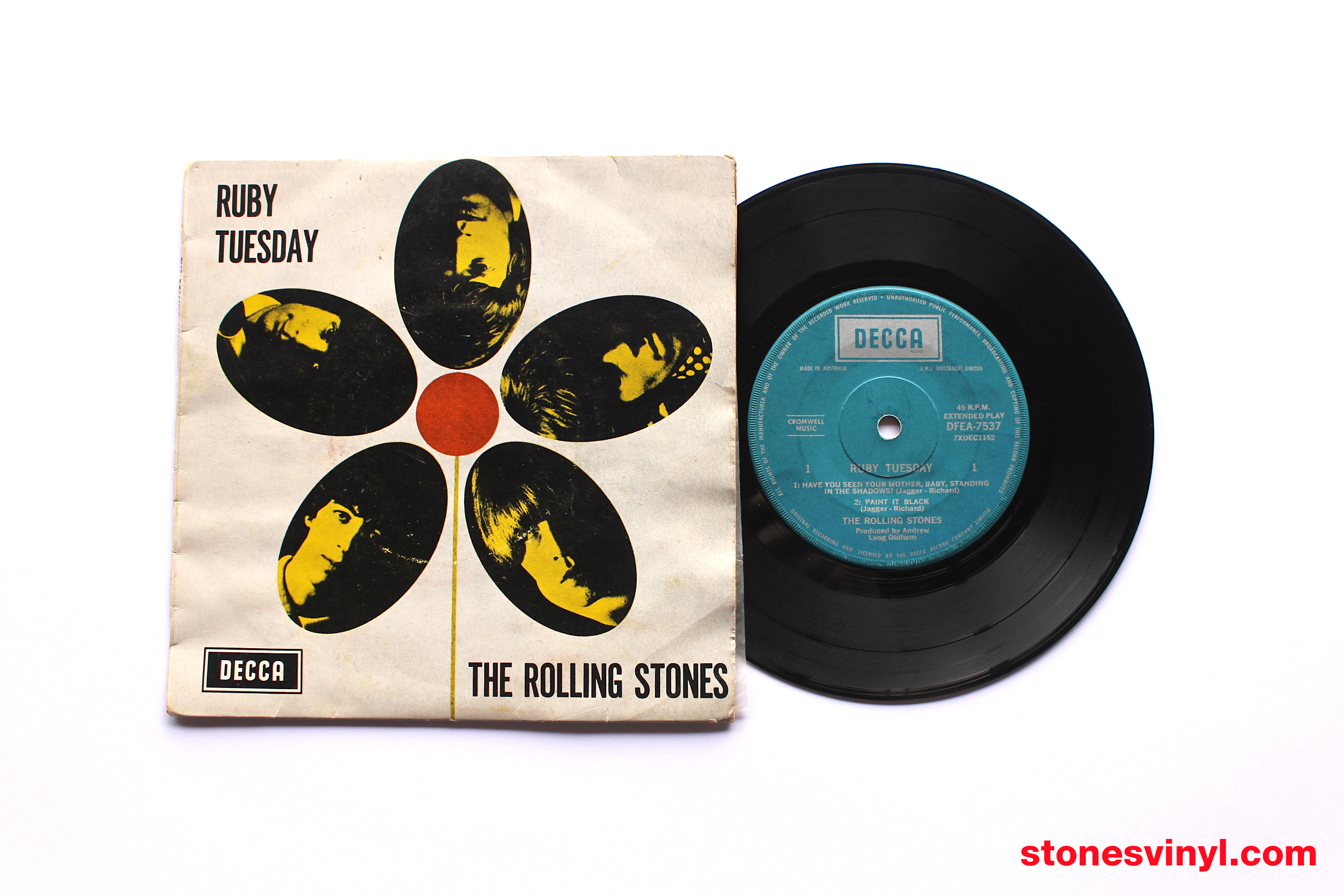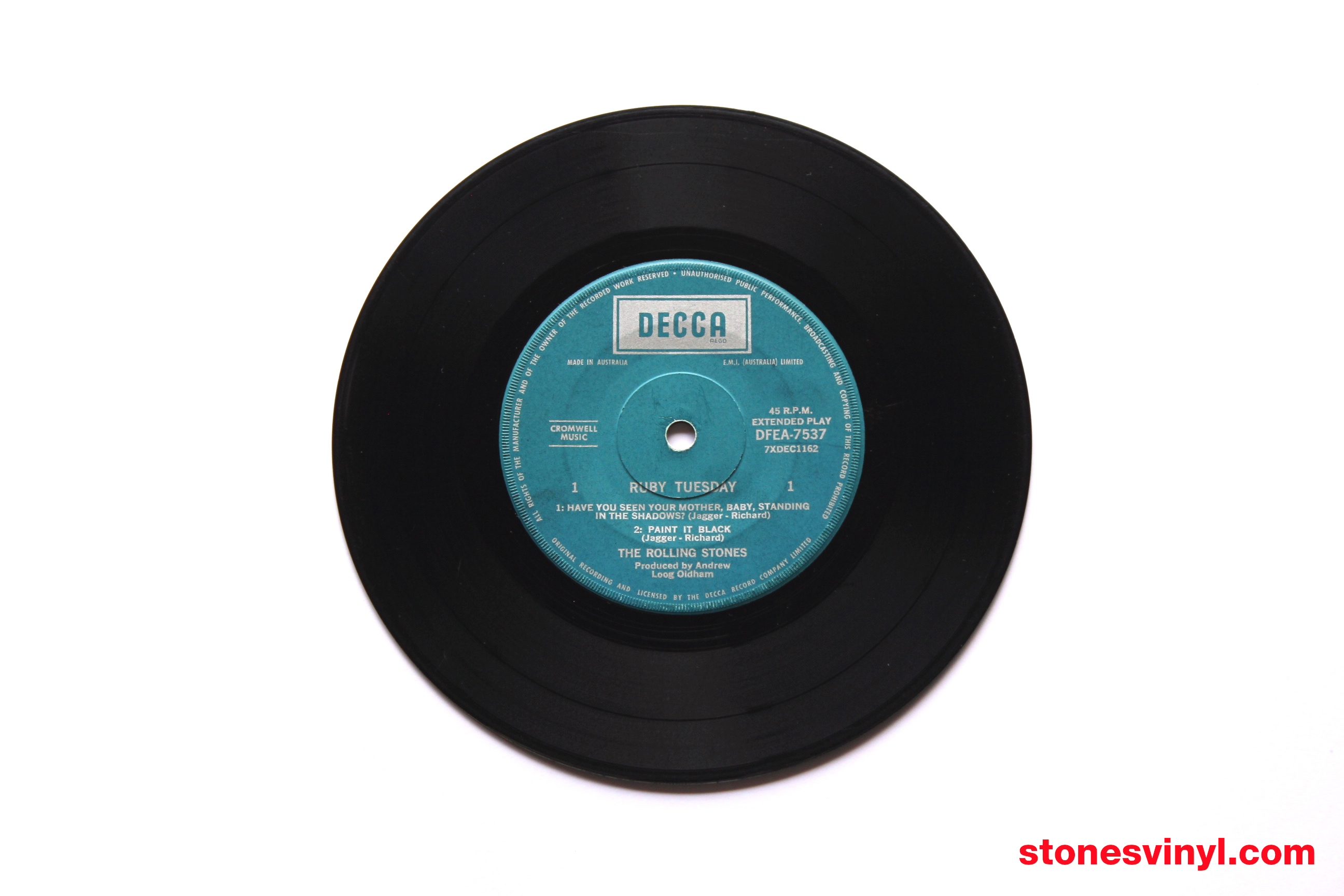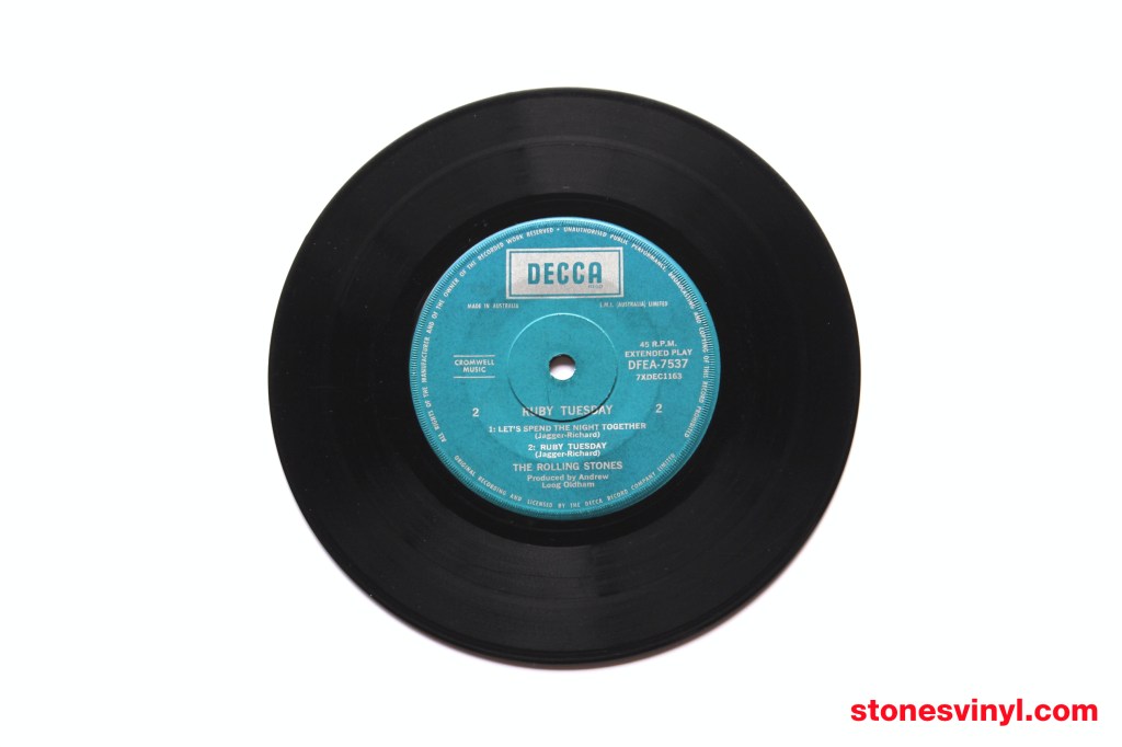 ‘Ruby Tuesday’ 7″ EP released in Australia in 1967. Cat: DFEA 7537. Tracklist side A: Have You Seen Your Mother, Baby, Standing In The Shadow? / Paint It, Black. Tracklist side B: Let’s Spend The Night Together / Ruby Tuesday. Matrix side A: 7XDEC 1162. Matrix side B: 7XDEC 1163.