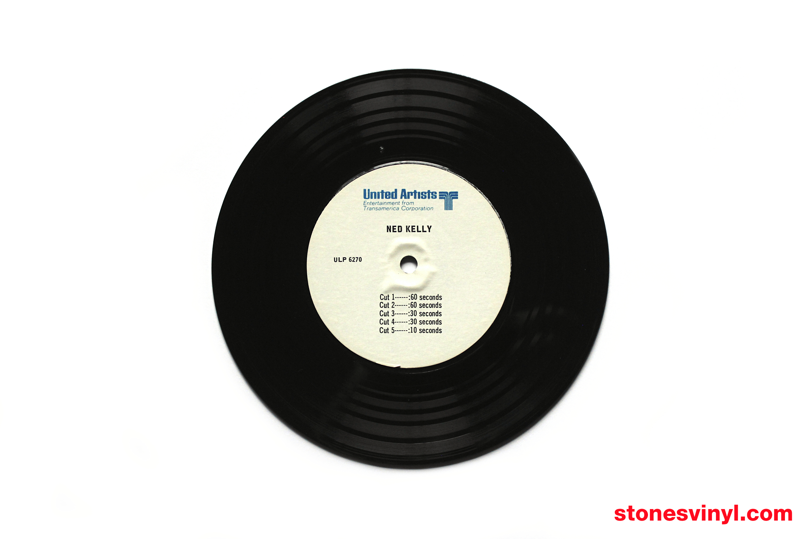 1970 promo only one-sided EP of 5 narrated radio spots (commercials) for “Ned Kelly” film starring Mick Jagger. Some Mick Jagger dialogue is heard on a few spots. Very rare!