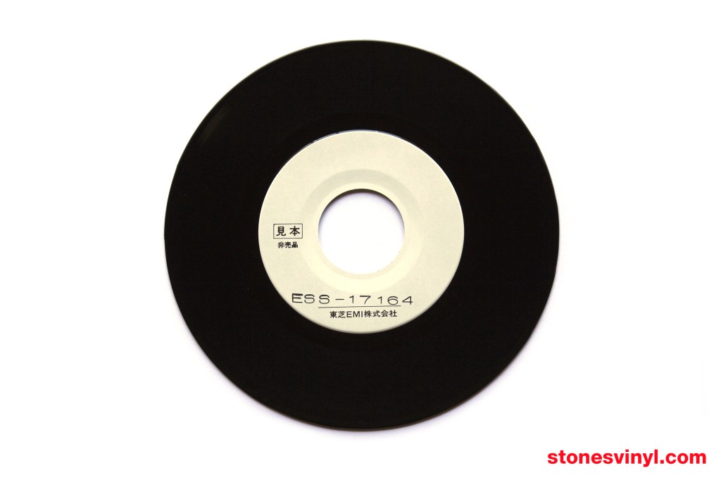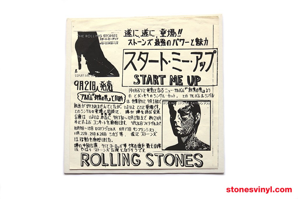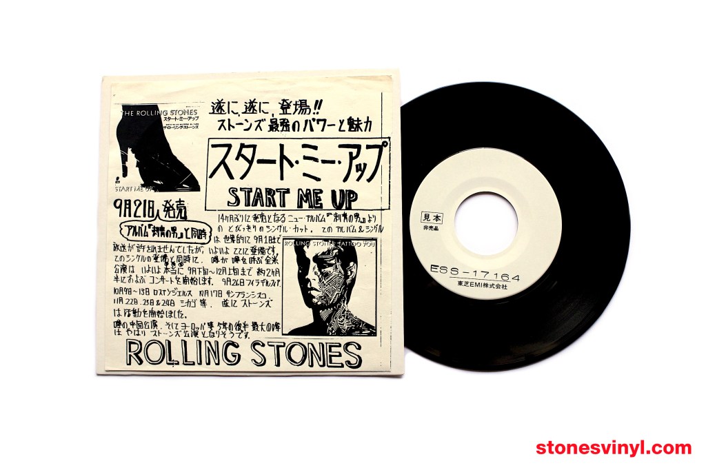 ‘Start Me Up’ 7″ test pressing released in Japan in 1981. White labels with custom text. Distributed as a pre-release item to radio station DJs. Includes b+w artisan sleeve with release details. Cat: EMI ESS 17164. Tracklist side A: Start Me Up. Tracklist side B: No Use In Crying.