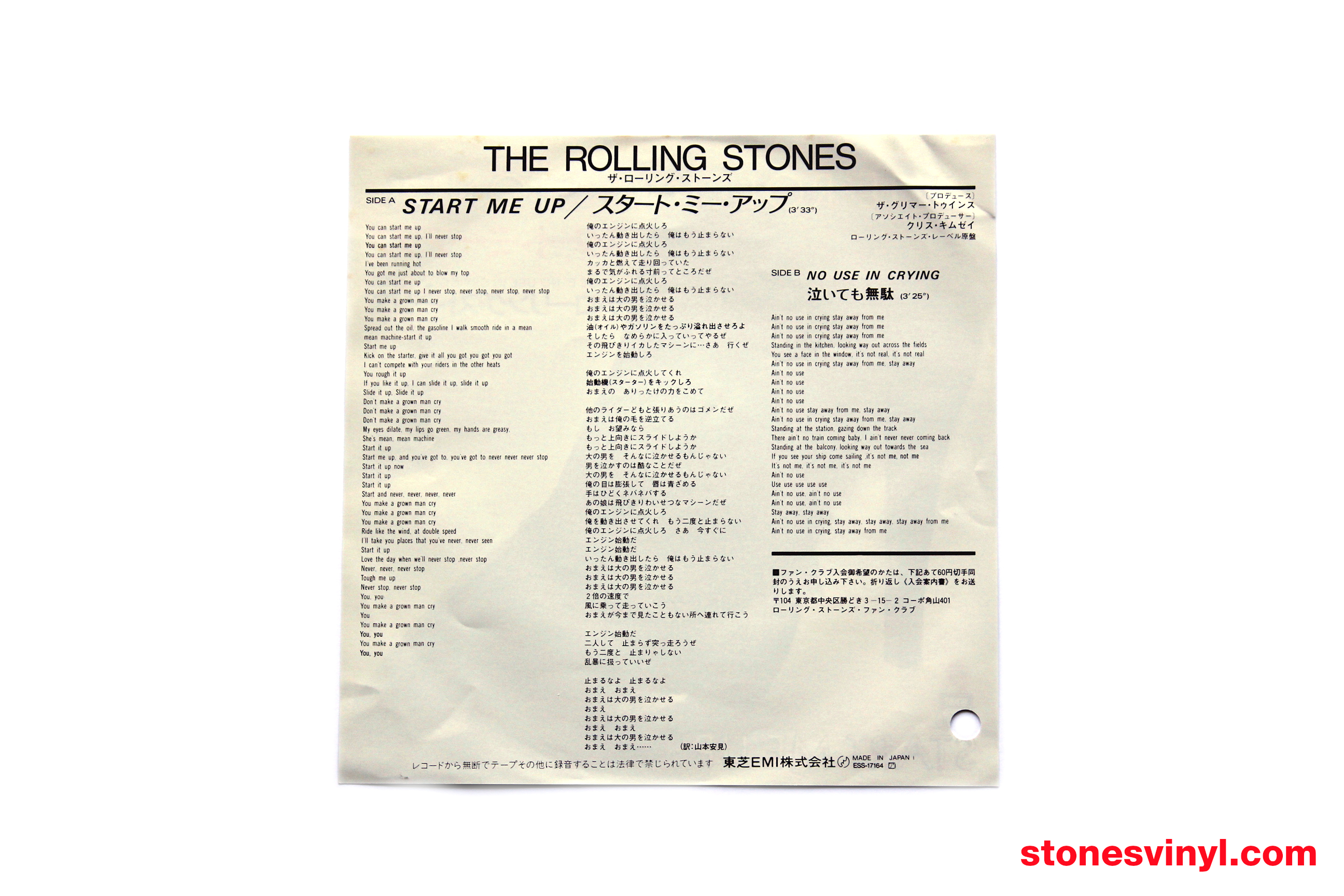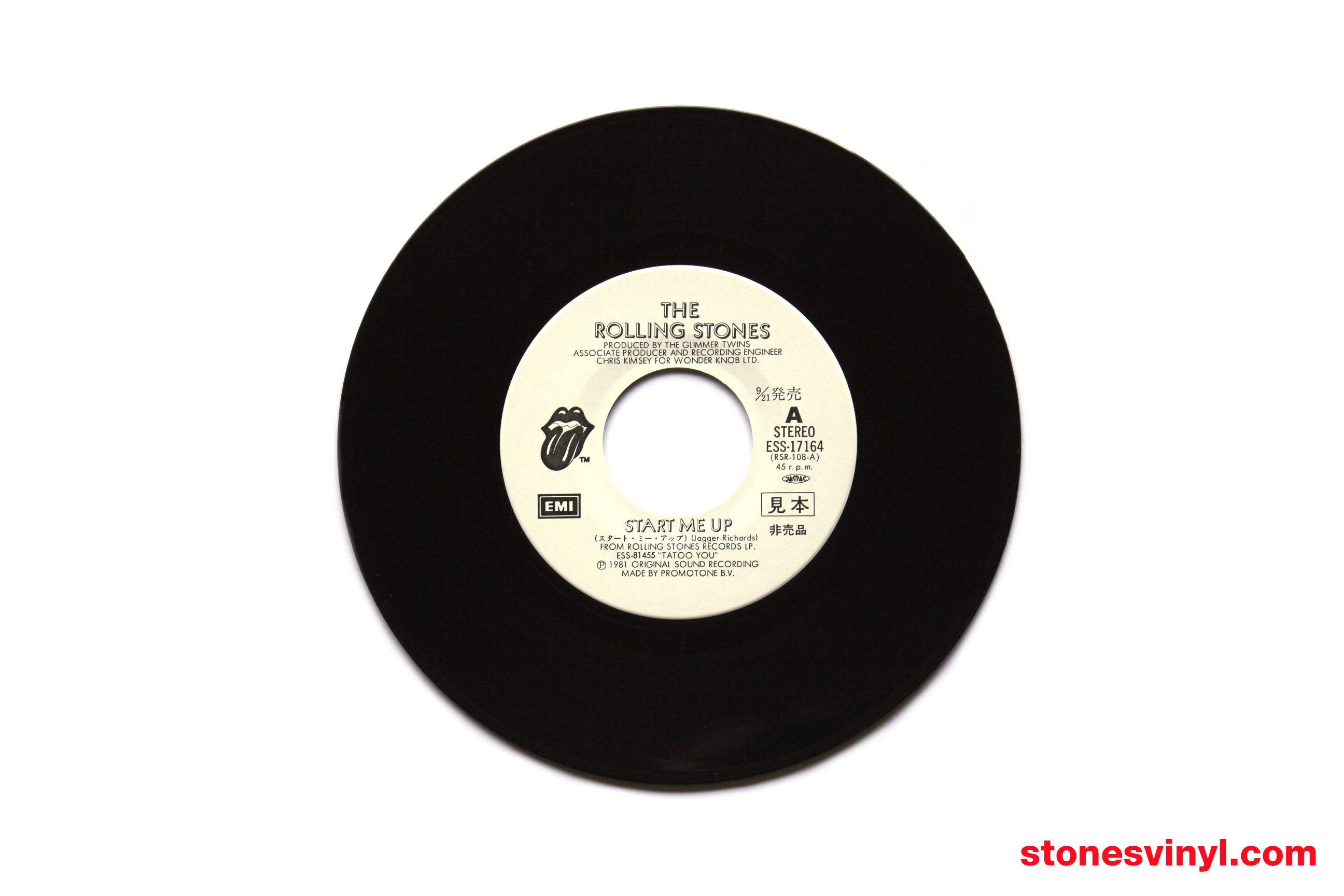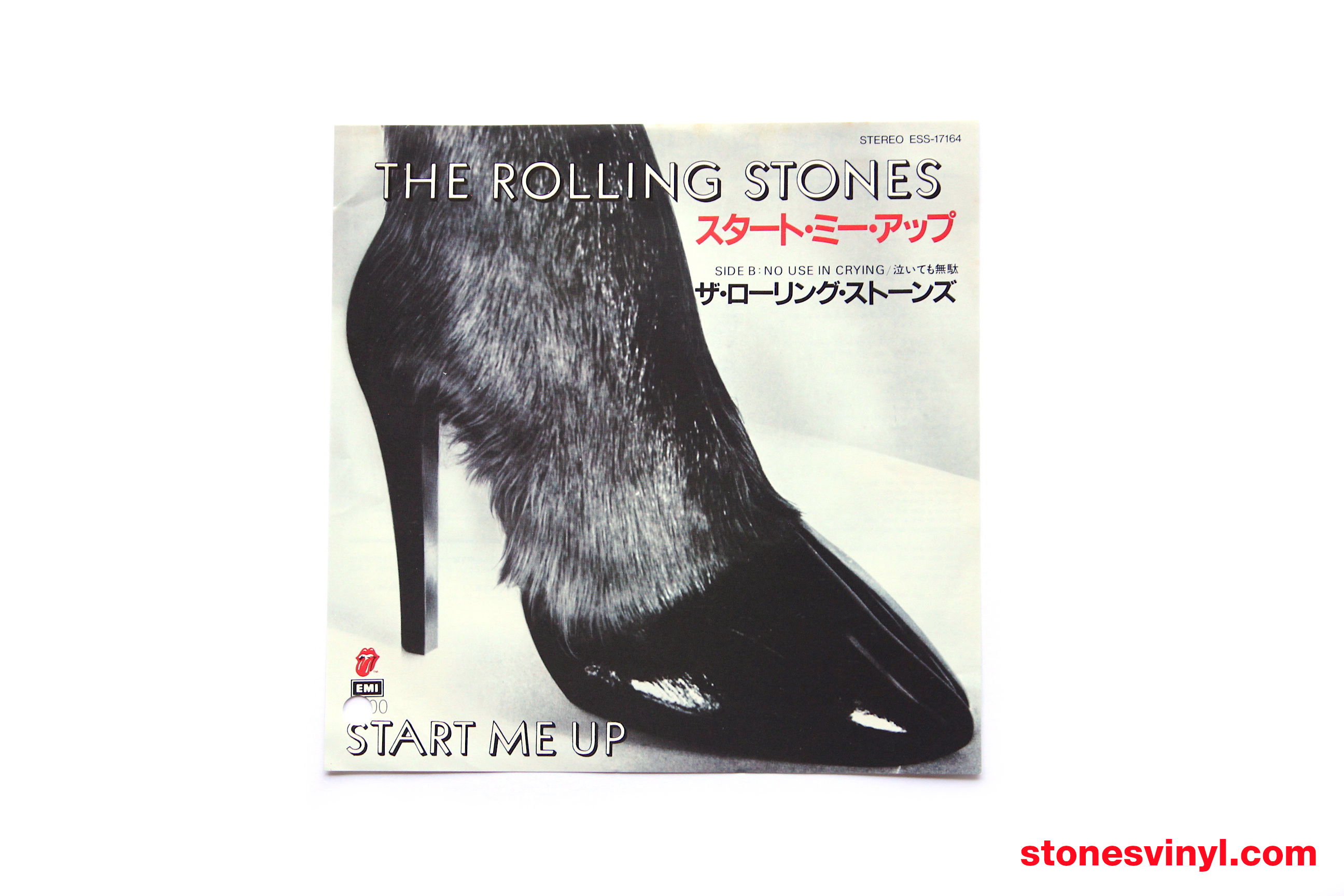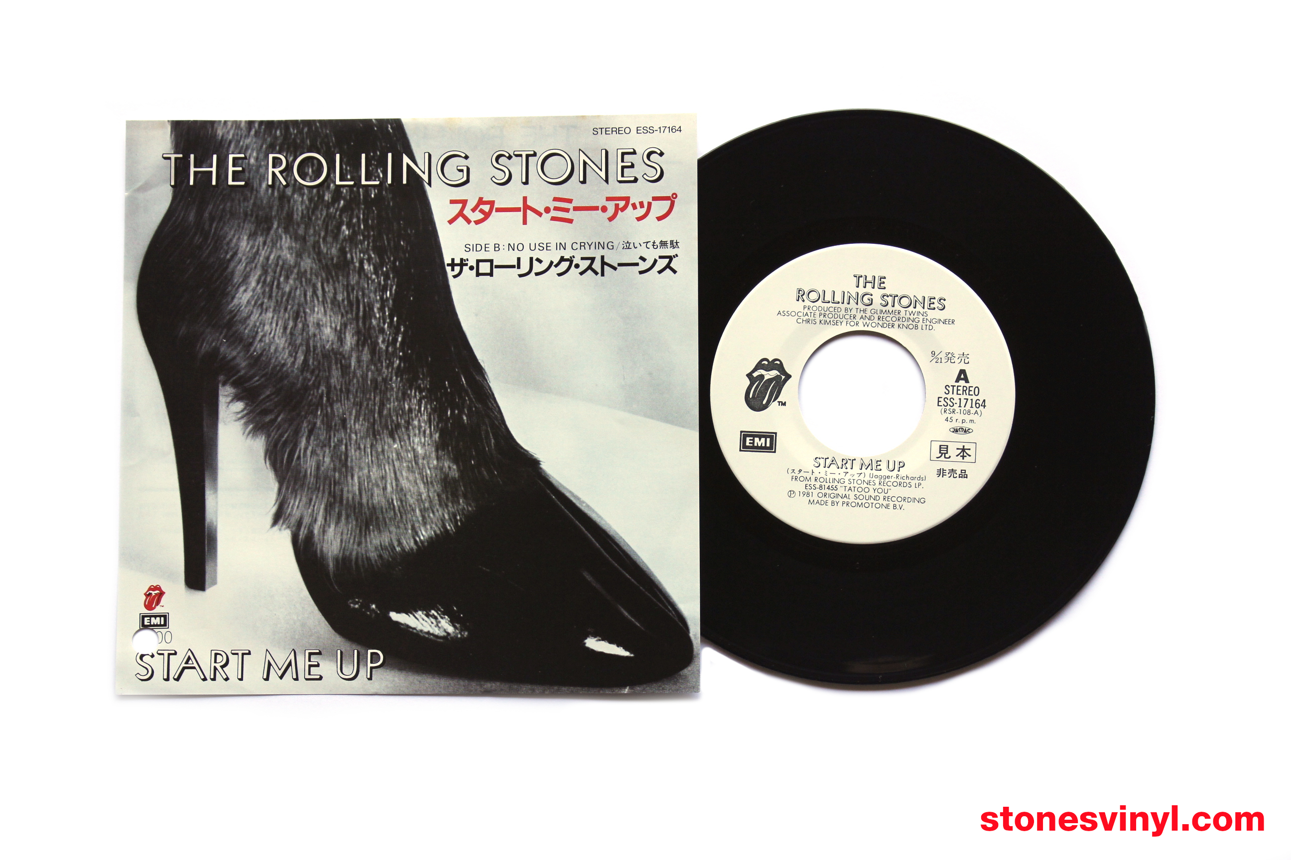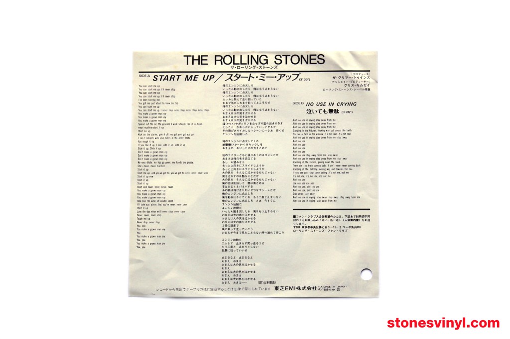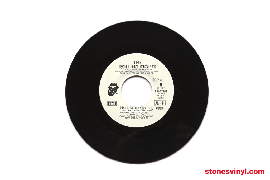 ‘Start Me Up’ 7″ white label promo released in Japan in 1981. Cat: EMI ESS 17164. Tracklist side A: Start Me Up. Tracklist side B: No Use In Crying. Matrix side A: RSR-108-A 1S 2. Matrix side B: RSR-108-B 1S 2.