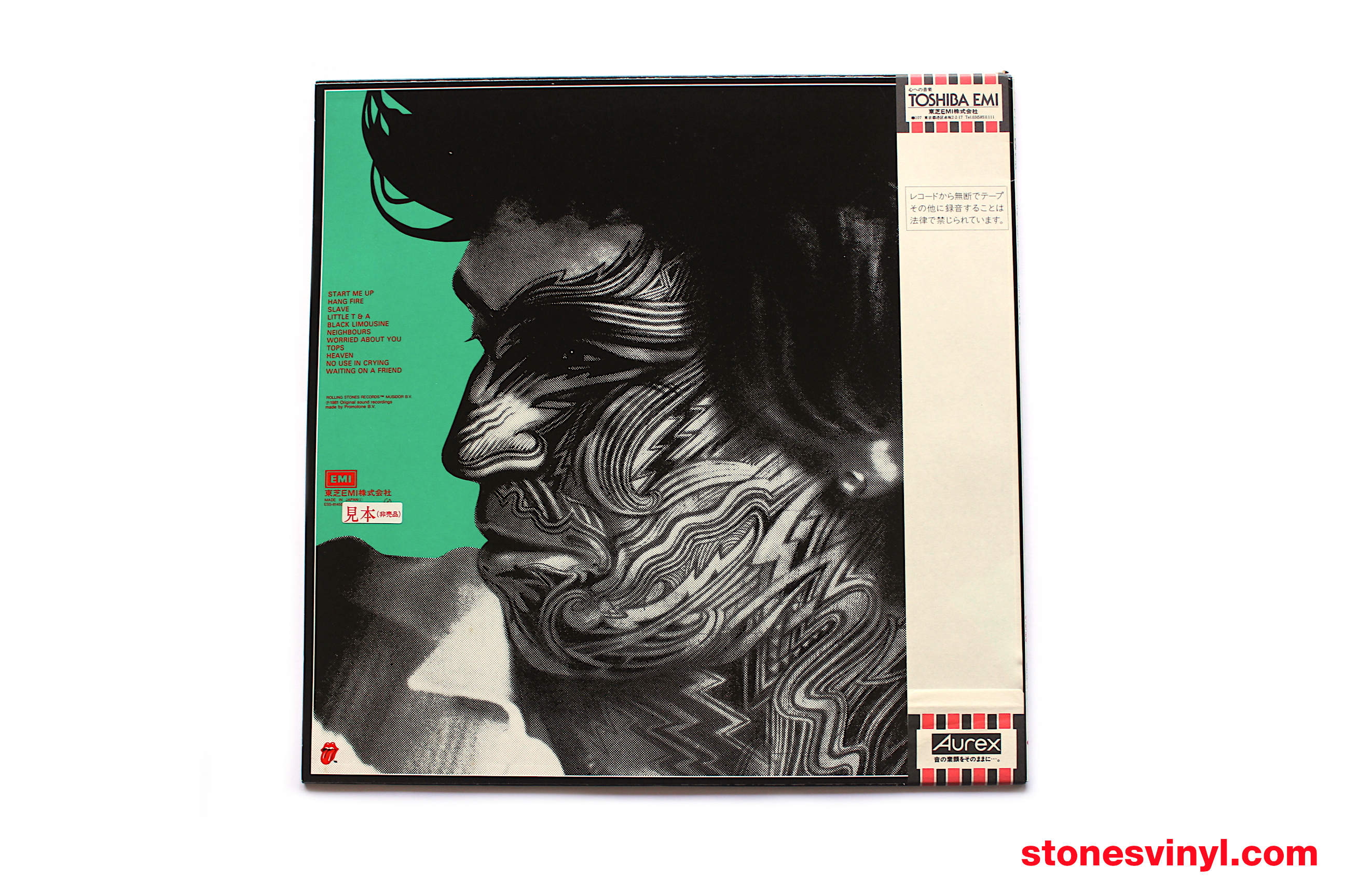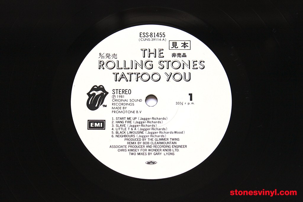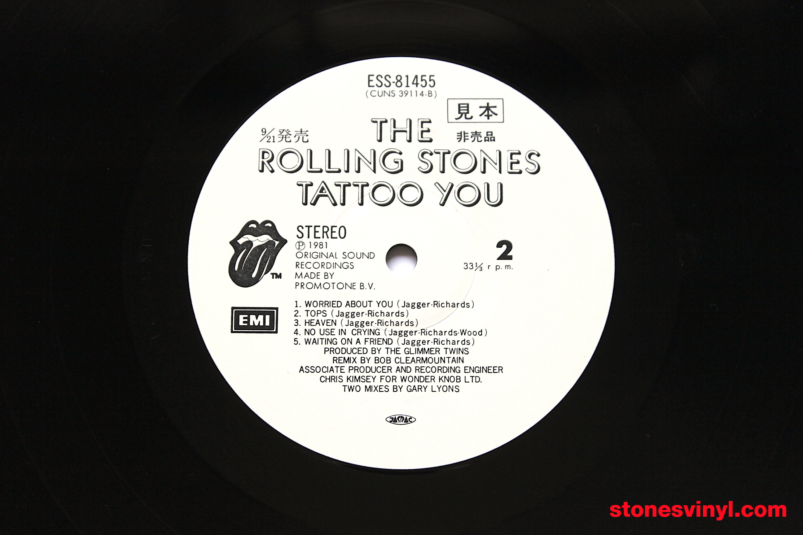 ‘Tattoo You’ white label promo LP released in Japan in 1981. Cat: ESS 81455. Includes black OBI with promo sticker. Tracklist side A: Start Me Up, Hang Fire, Slave, Little T&A, Black Limousine, Neighbours. Tracklist side B: Worried About You, Tops, Heaven, No Use In Crying, Waiting On A Friend. Matrix side A: CUNS-39114-A 1S. Matrix side B: CUNS-39114-B 1S.