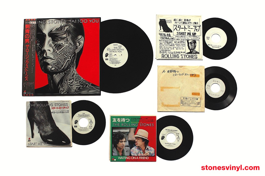 > Japanese ‘Waiting on A Friend’ (1981) white label promo 7″, cat: EMI ESS 17228.