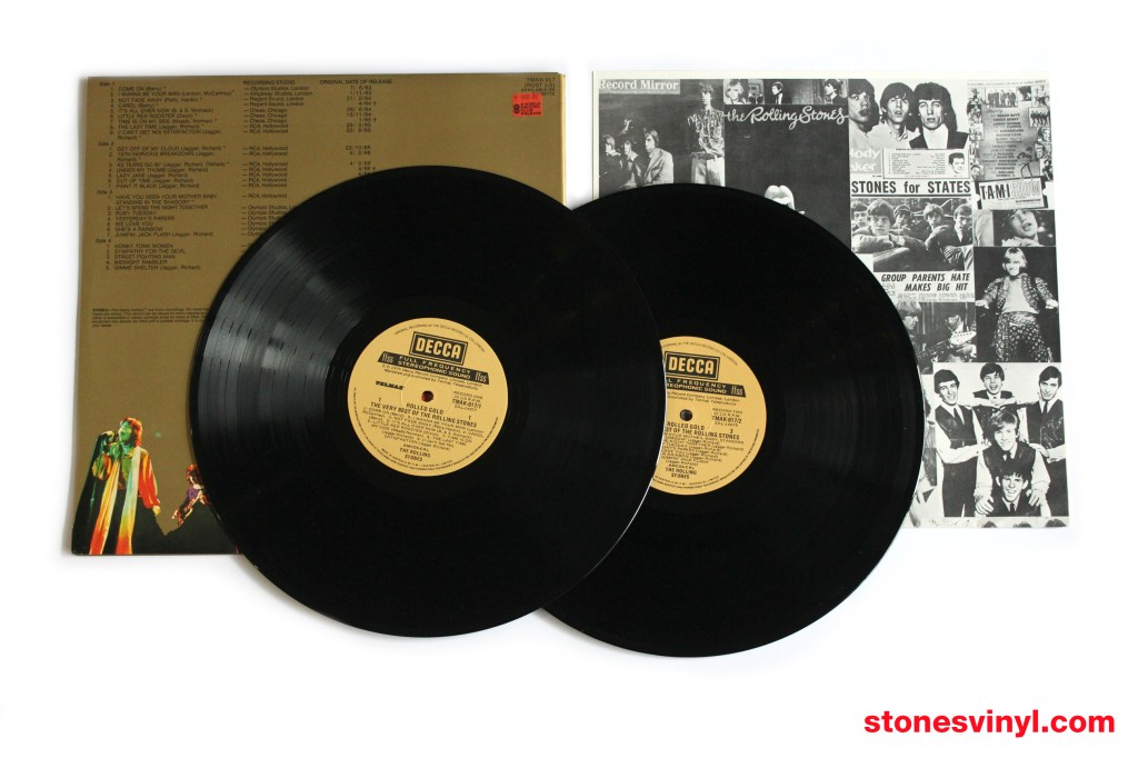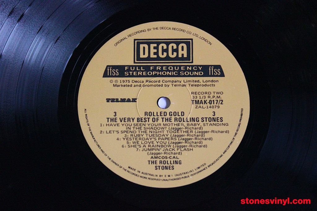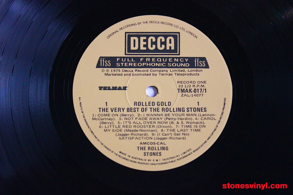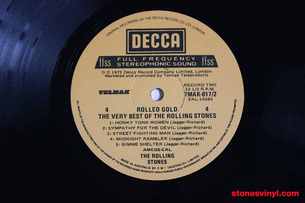 ‘Rolled Gold’ (1975) 2LP set, 1978 re-issue for distribution by the Australian World Record Club (WRC). WRC Cat: R 90130. Tracklist side A: Come On, I Wanna Be Your Man, Not Fade Away, Carol, It’s All Over Now, Little Red Rooster, Time Is On My Side, The Last Time, (I Can’t Get No) Satisfaction. Tracklist side B: Get Off Of My Cloud, 19th Nervous Breakdown, As Tears Go By, Under My Thumb, Lady Jane, Out Of Time, Paint It Black. Tracklist side C: Have You Seen Your Mother Baby, Standing In The Shadow?, Let’s Spend The Night Together, Ruby Tuesday, Yesterday’s Papers, We Love You, She’s A Rainbow, Jumpin’ Jack Flash. Tracklist side D: Honky Tonk Women, Sympathy For The Devil, Street Fighting Man, Midnight Rambler, Gimme Shelter.