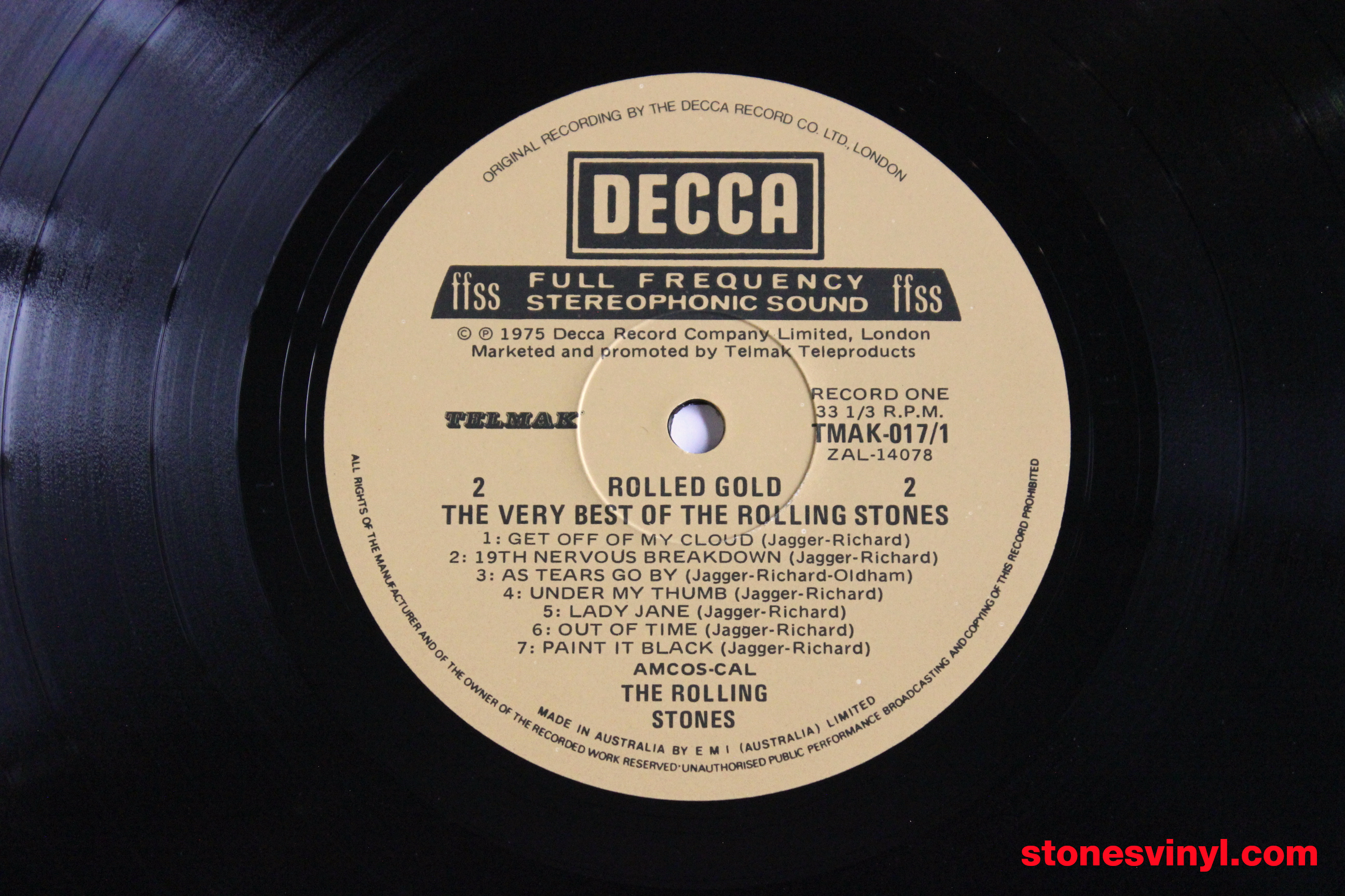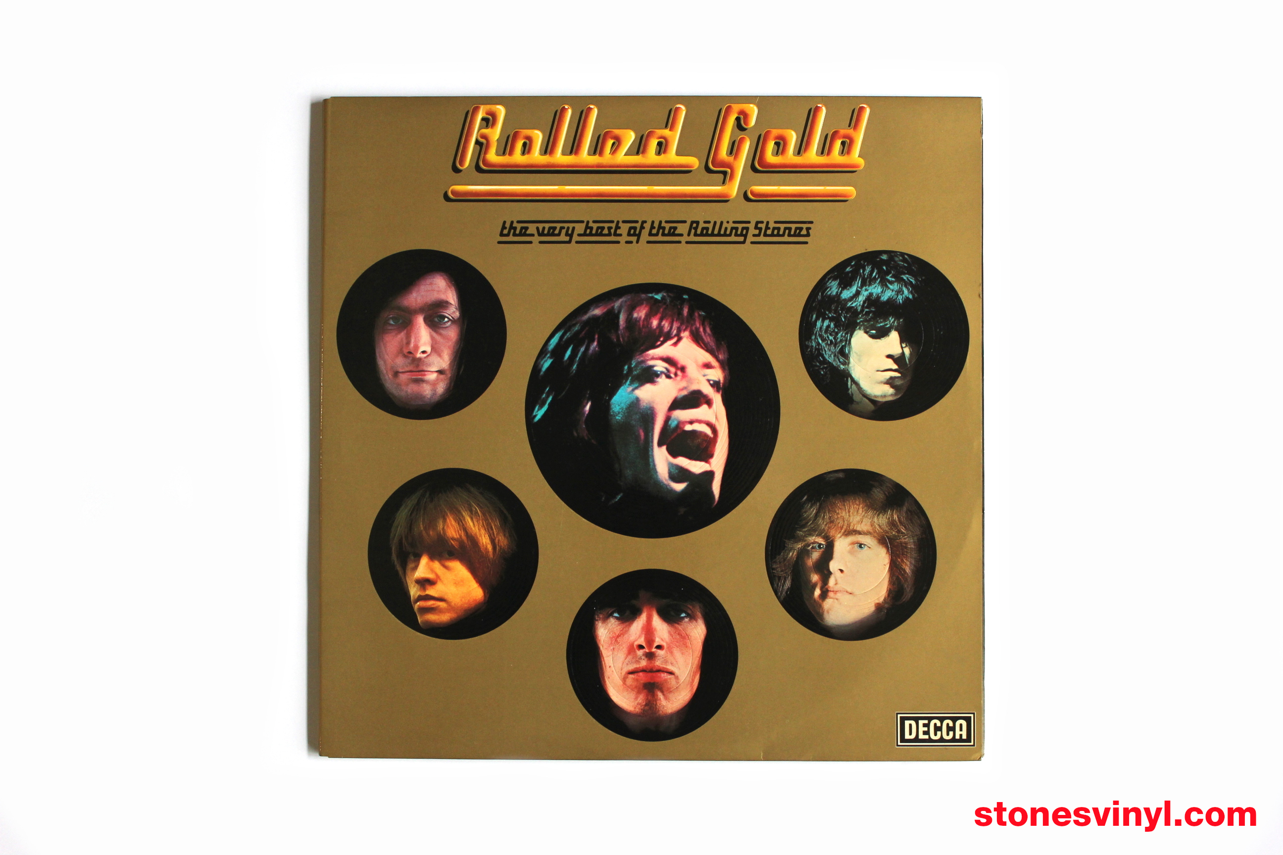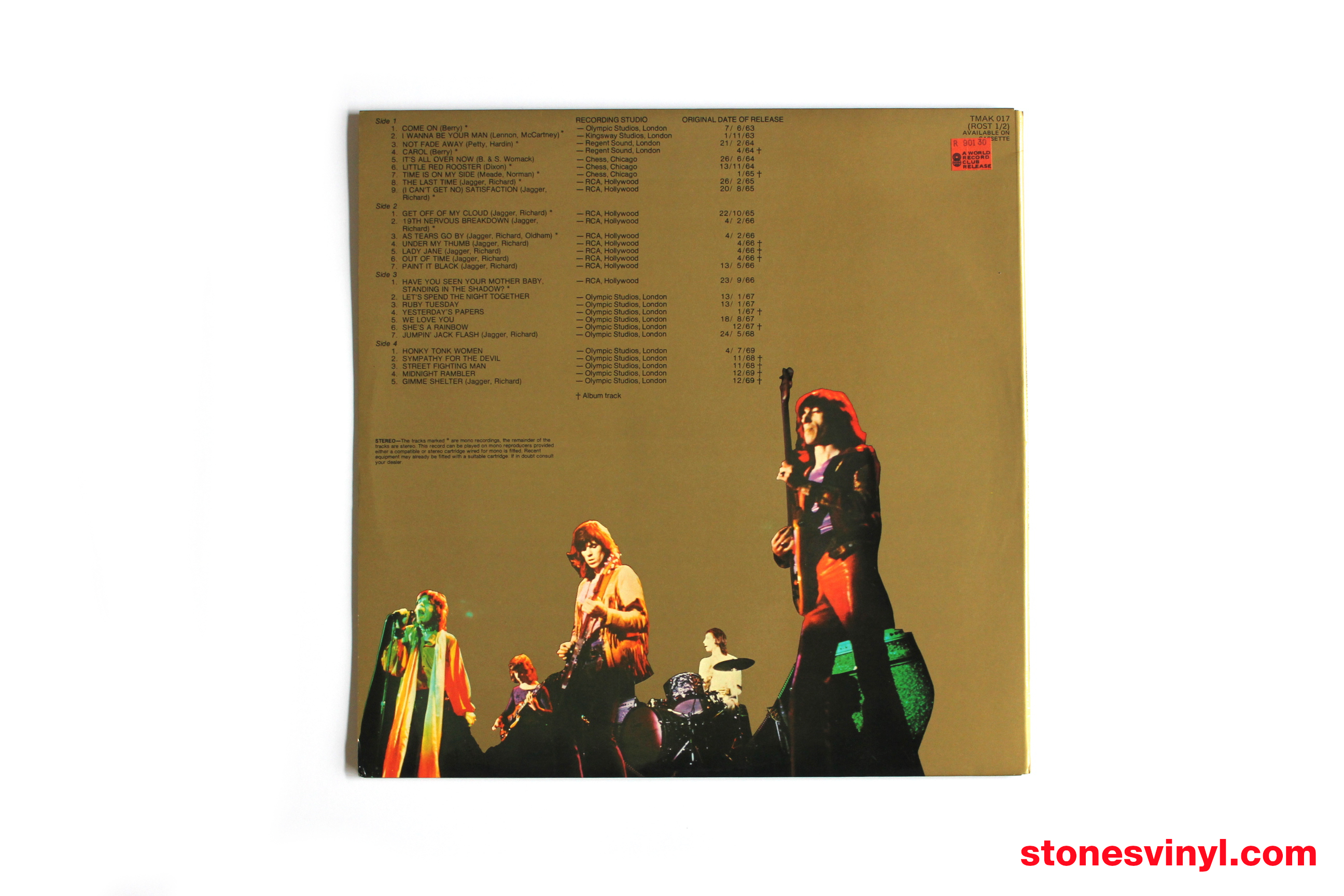 ‘Rolled Gold’ (1975) 2LP set, 1978 re-issue for distribution by the Australian World Record Club (WRC). WRC Cat: R 90130. Tracklist side A: Come On, I Wanna Be Your Man, Not Fade Away, Carol, It’s All Over Now, Little Red Rooster, Time Is On My Side, The Last Time, (I Can’t Get No) Satisfaction. Tracklist side B: Get Off Of My Cloud, 19th Nervous Breakdown, As Tears Go By, Under My Thumb, Lady Jane, Out Of Time, Paint It Black. Tracklist side C: Have You Seen Your Mother Baby, Standing In The Shadow?, Let’s Spend The Night Together, Ruby Tuesday, Yesterday’s Papers, We Love You, She’s A Rainbow, Jumpin’ Jack Flash. Tracklist side D: Honky Tonk Women, Sympathy For The Devil, Street Fighting Man, Midnight Rambler, Gimme Shelter.