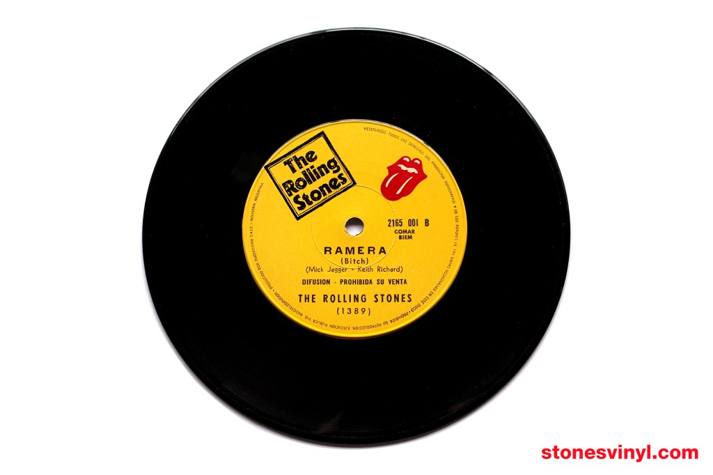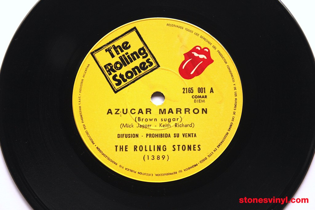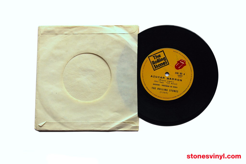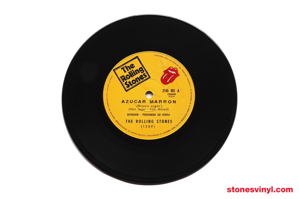 ‘Brown Sugar’ 7″ promo released in Argentina in 1971. Cat: RSR 2165001. Tracklist side A: Brown Sugar. Tracklist side B: Bitch. Matrix side A: 2165001 A 1389. Matrix side B: 2165001 B 1389.