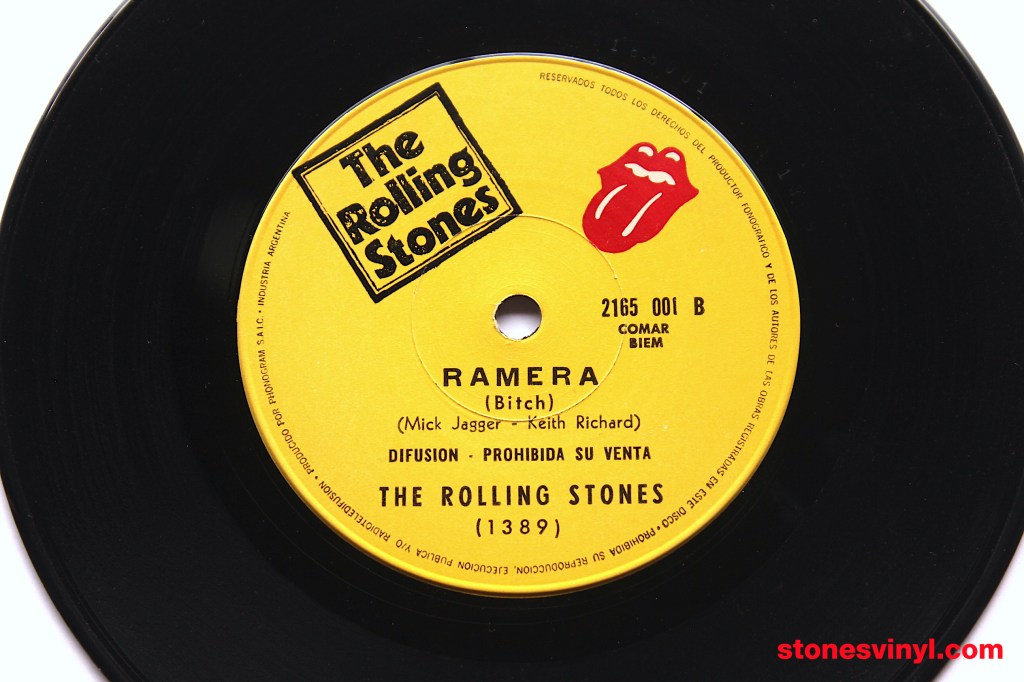 COLLECTORS NOTE: Very rare! This is the first time an image of this promo pressing has ever been published. Prior to appearing here at my blog, no image of this item has ever been published online or in a book. The existence of this item was noted in some old publications, strangely listed as a “jukebox promo” (no other promo from Argentina has been listed as a ‘jukebox’ promo, so why this one is a mystery). As shown in my photos, the promo item does not have the large centre hole associated with jukebox singles, so maybe this was misinformation in books, and the authors obviously hadn’t seen the item. In reality, this promo is similar to the standard Argentina ‘Brown Sugar’ release except it features “DIFUSION – PROHIBIDA SU VENTA” printed in the label. Distributed in a plain white sleeve. Importantly, this ‘Brown Sugar’ item marks a period of transition in the Argentinian pressings, from London to Music Hall labels. Later promo pressings from Argentina in the 1970s would feature distinctive white labels from Music Hall.