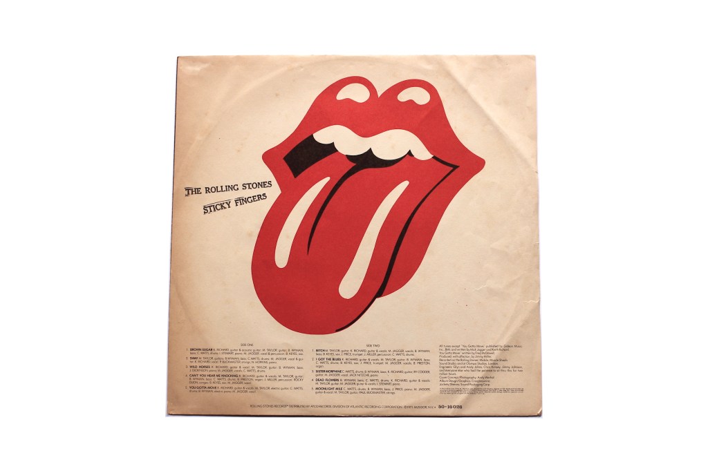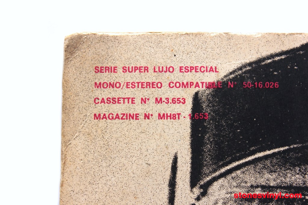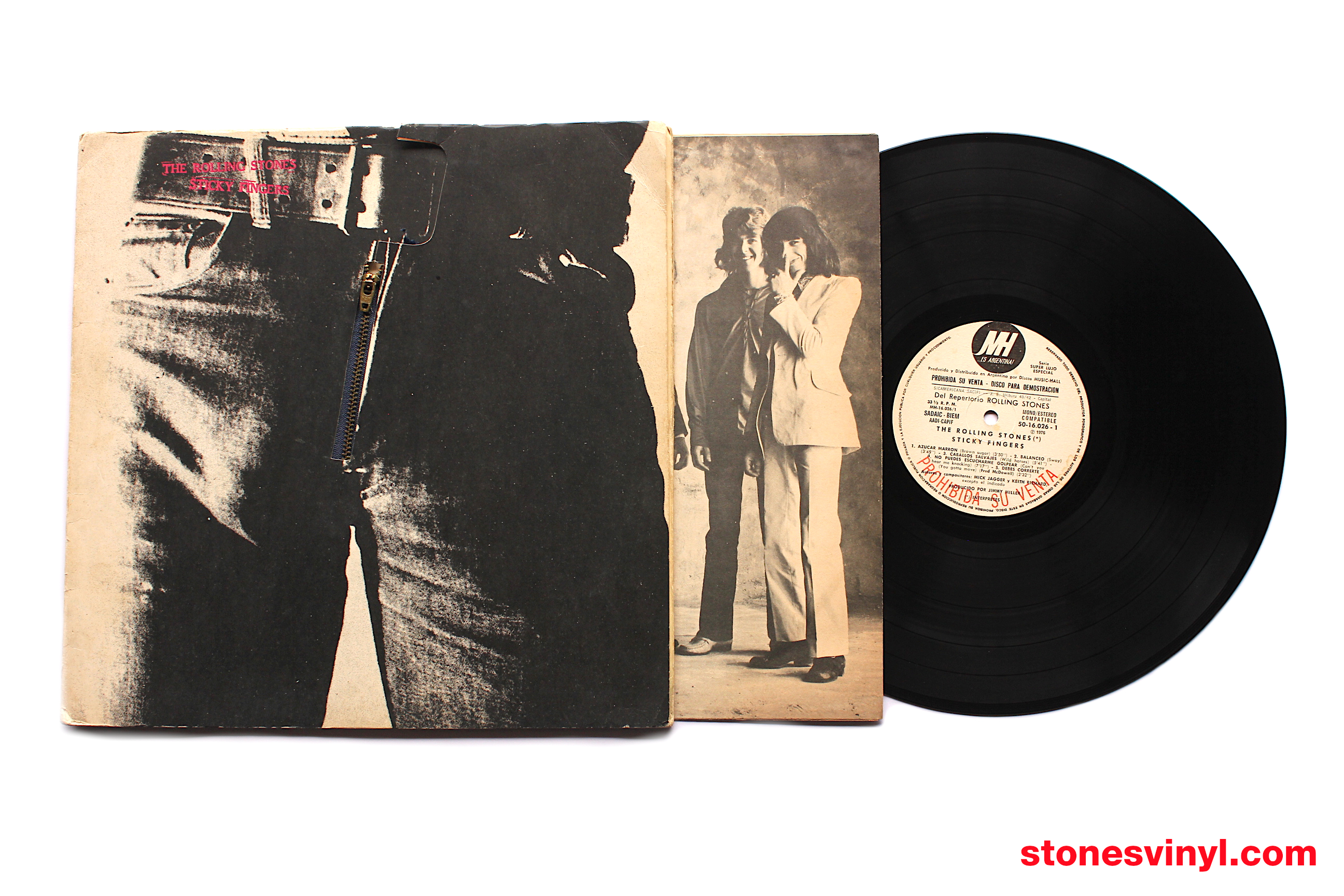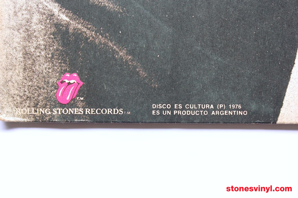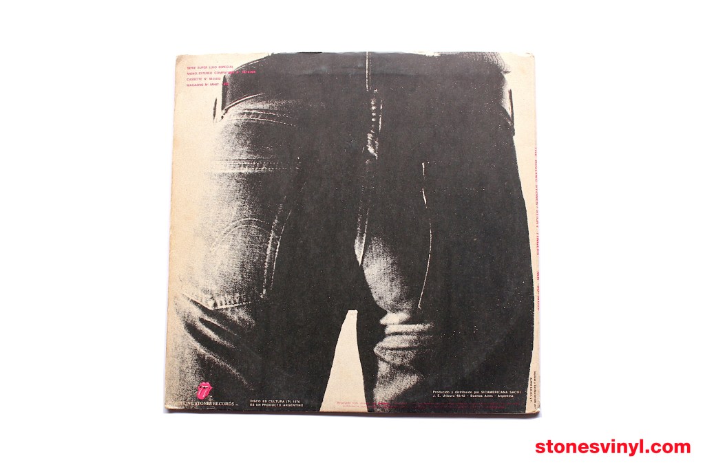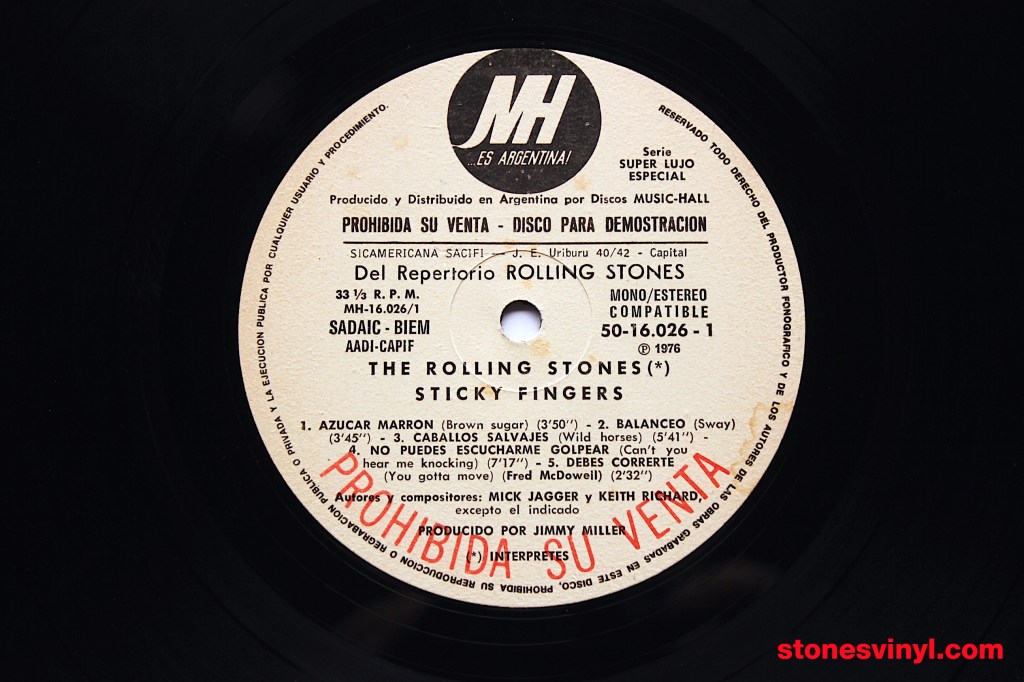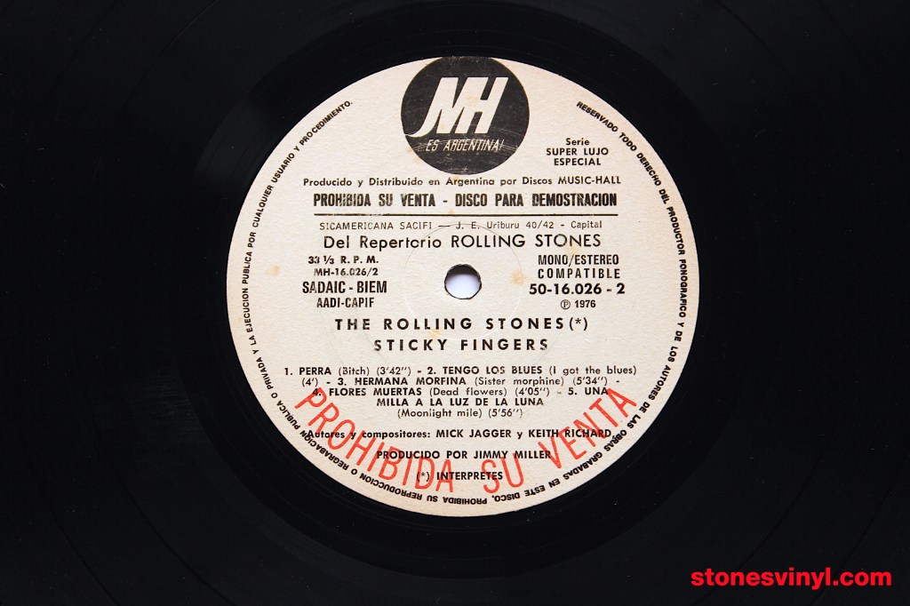 ‘Sticky Fingers’ white label promo LP released in Argentina in 1976. Cat: 50-16.026. Tracklist side A: Brown Sugar, Sway, Wild Horses, Can’t You Hear Me Knocking, You Gotta Move. Tracklist side B: Bitch, I Got The Blues, Sister Morphine, Dead Flowers, Moonlight Mile.