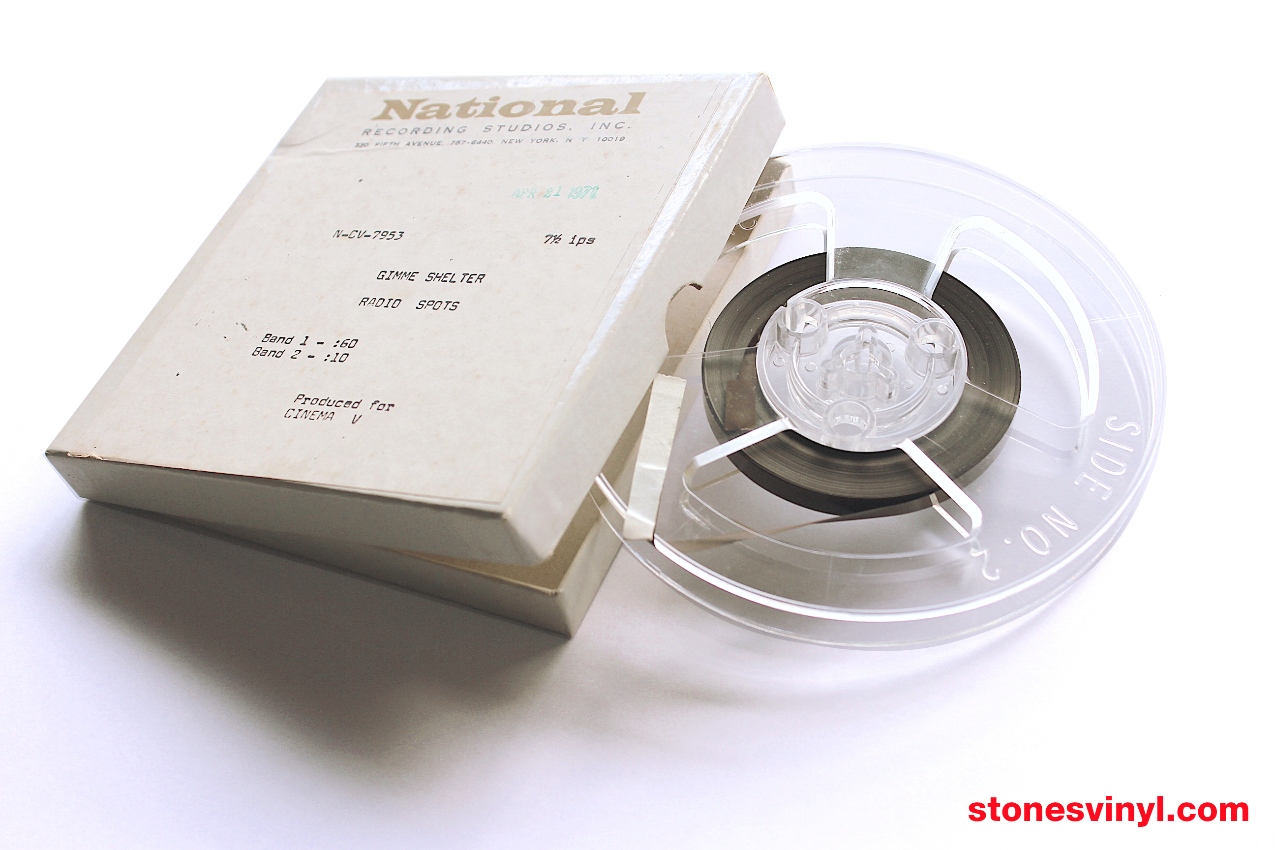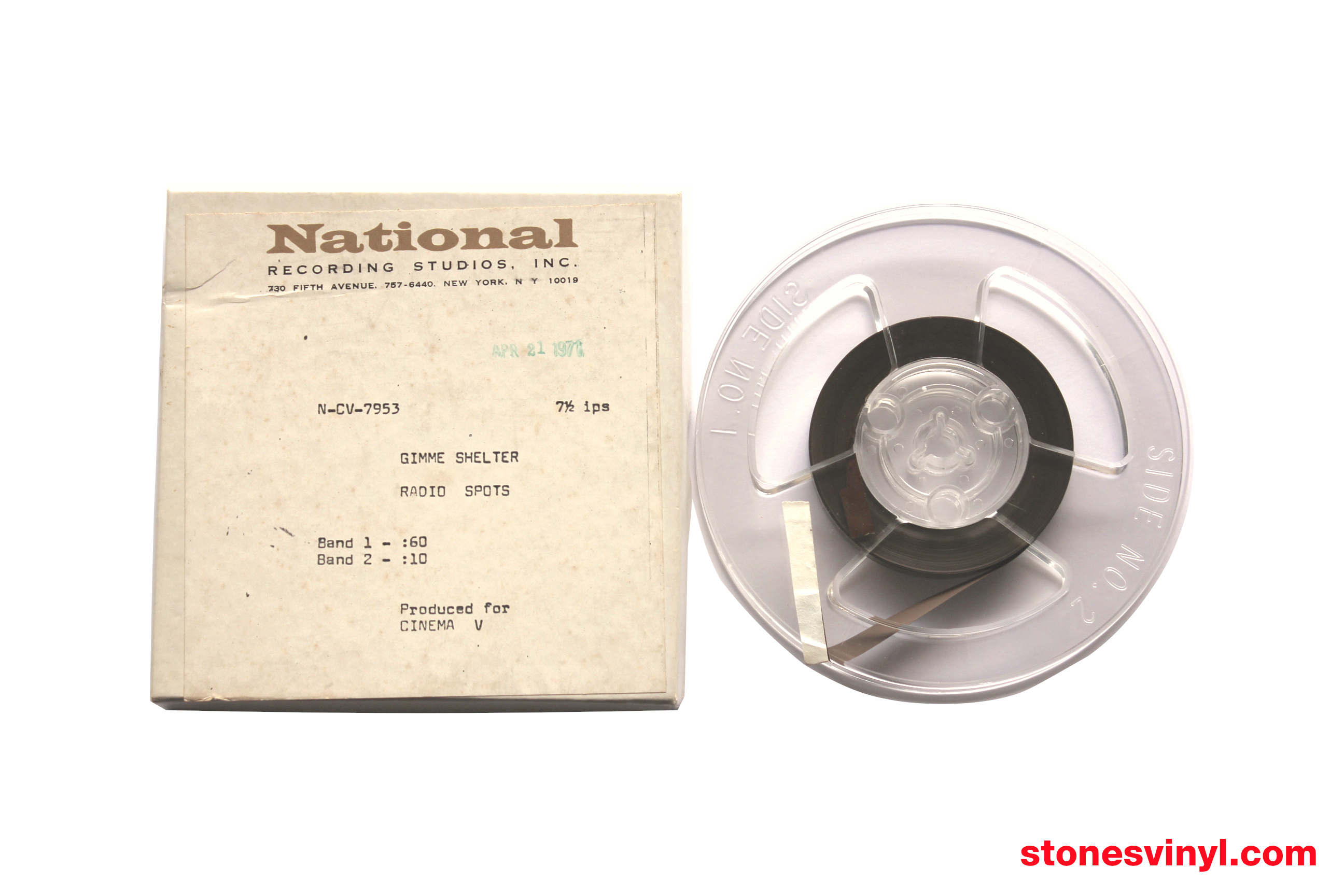 1971 reel-to-reel radio spots for the ‘Gimme Shelter’ documentary film, directed by Albert Maysles, David Maysles, and Charlotte Zwerin. Reel-to-reel plays at 7 1/2 ips. Features a promotional 60 second radio spot, and a promotional 10 second radio spot. Officially dated April 21 1971. Produced for Cinema V. Comes in a box from ‘National Recording Studios NY’.