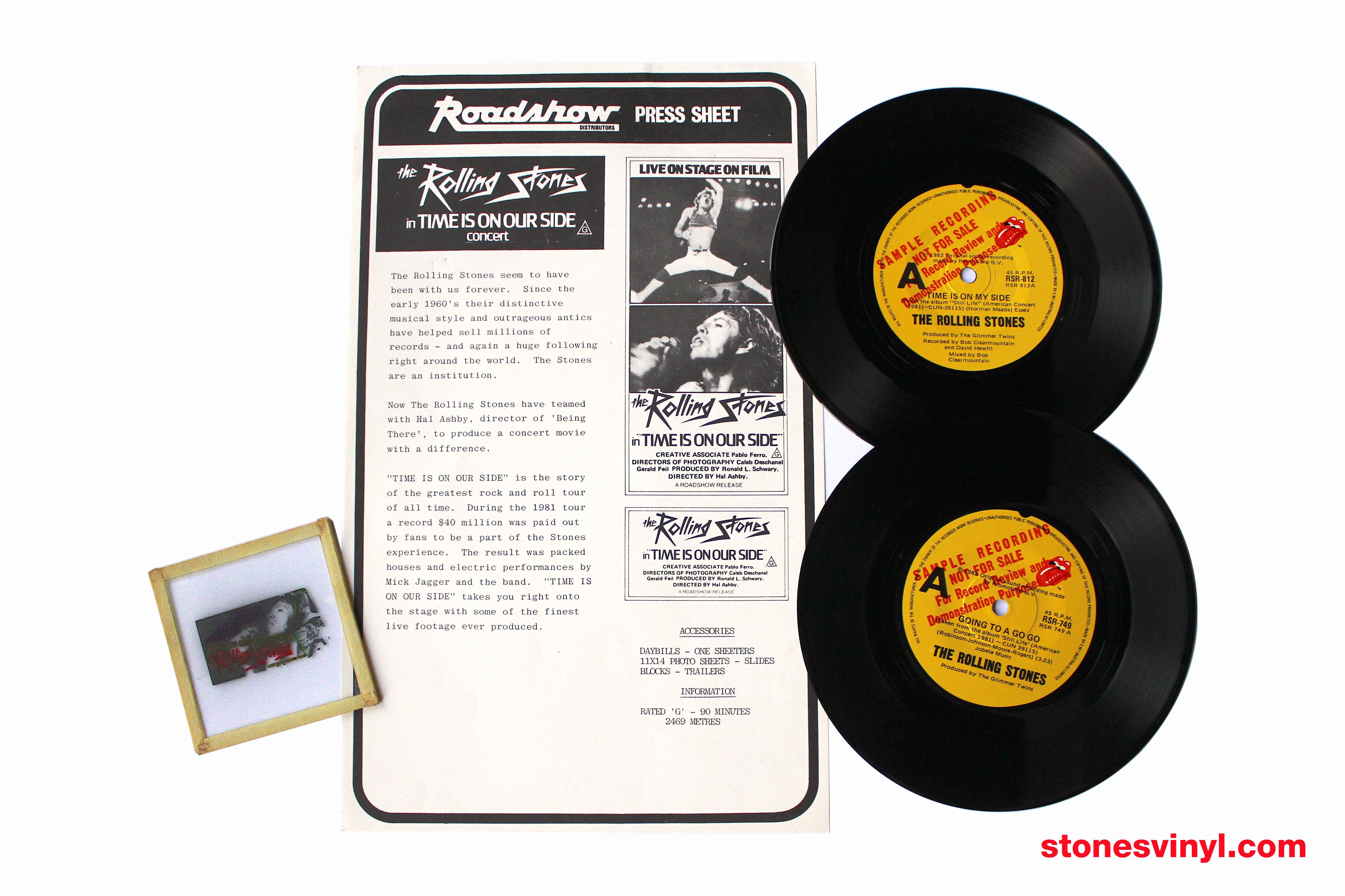 Group photo of rare promotional items for the Rolling Stones feature film ‘Time Is On Our Side’ (1982), together with two Australian promo 7″ singles from the related ‘Still Life’ (1982) LP. Note: The film ‘Time Is On Our Side’ was released in the USA and most other territories with the different title ‘Let’s Spend The Night Together’.