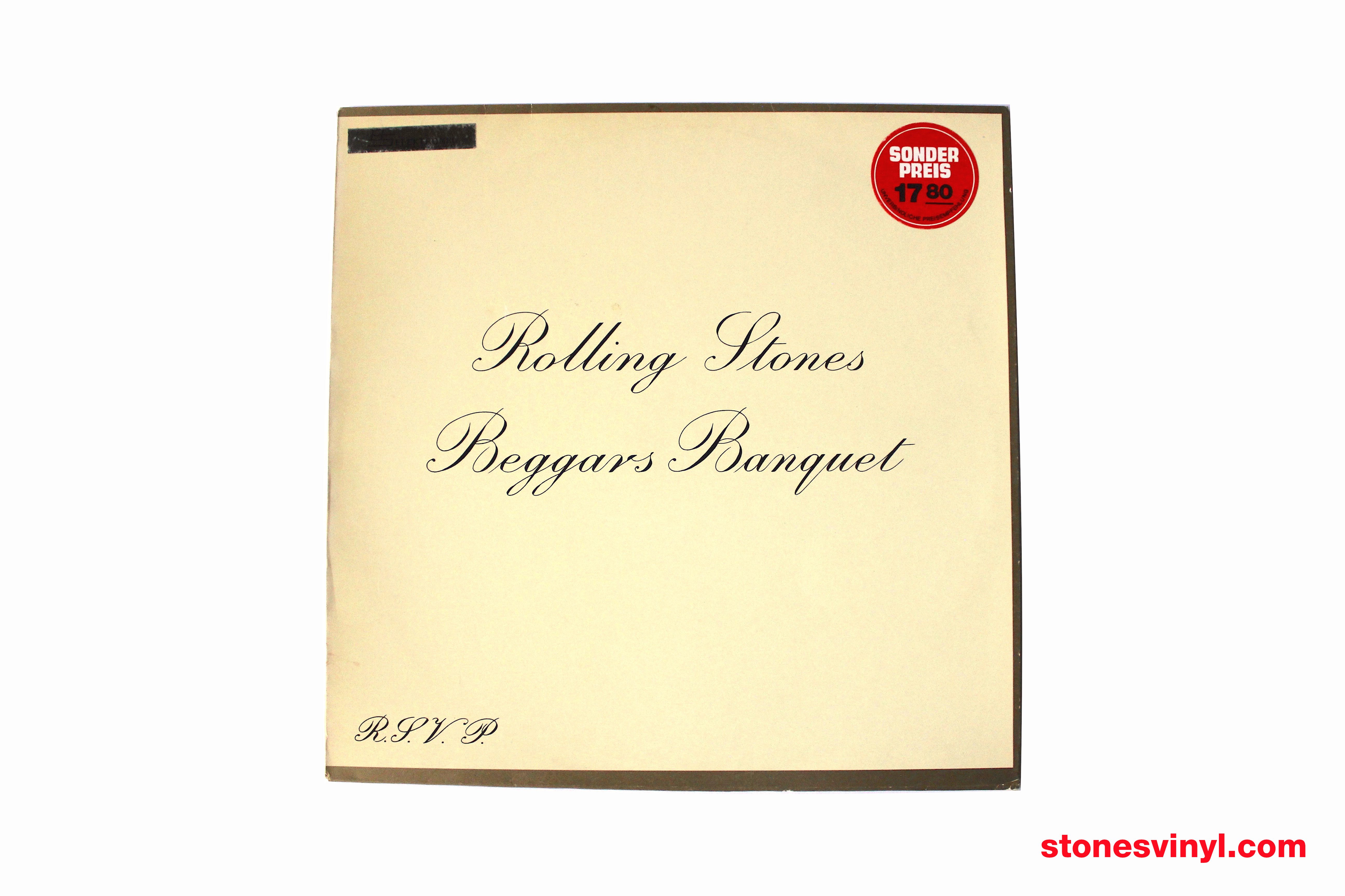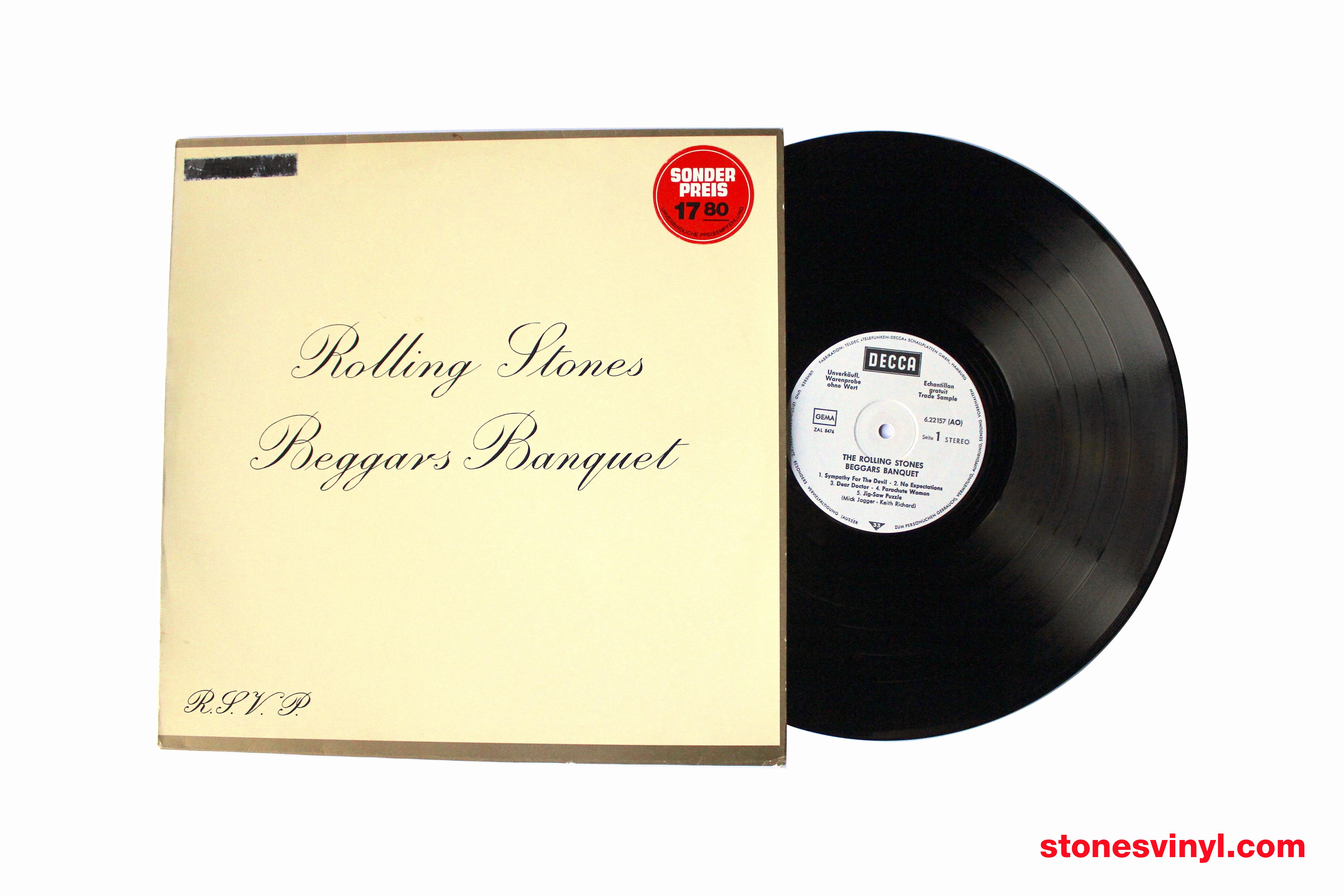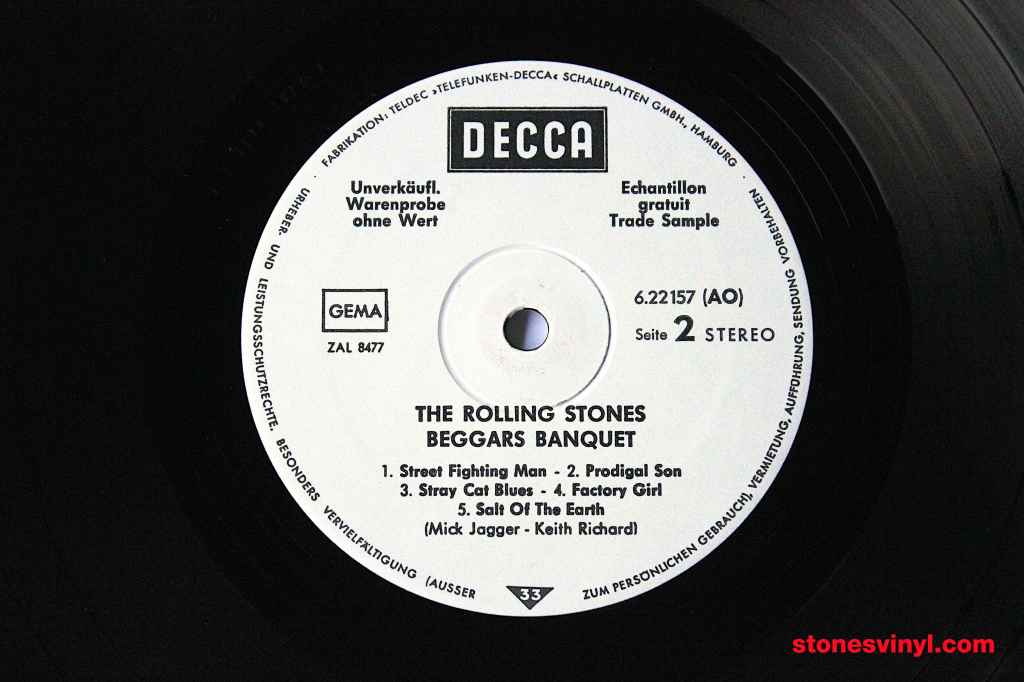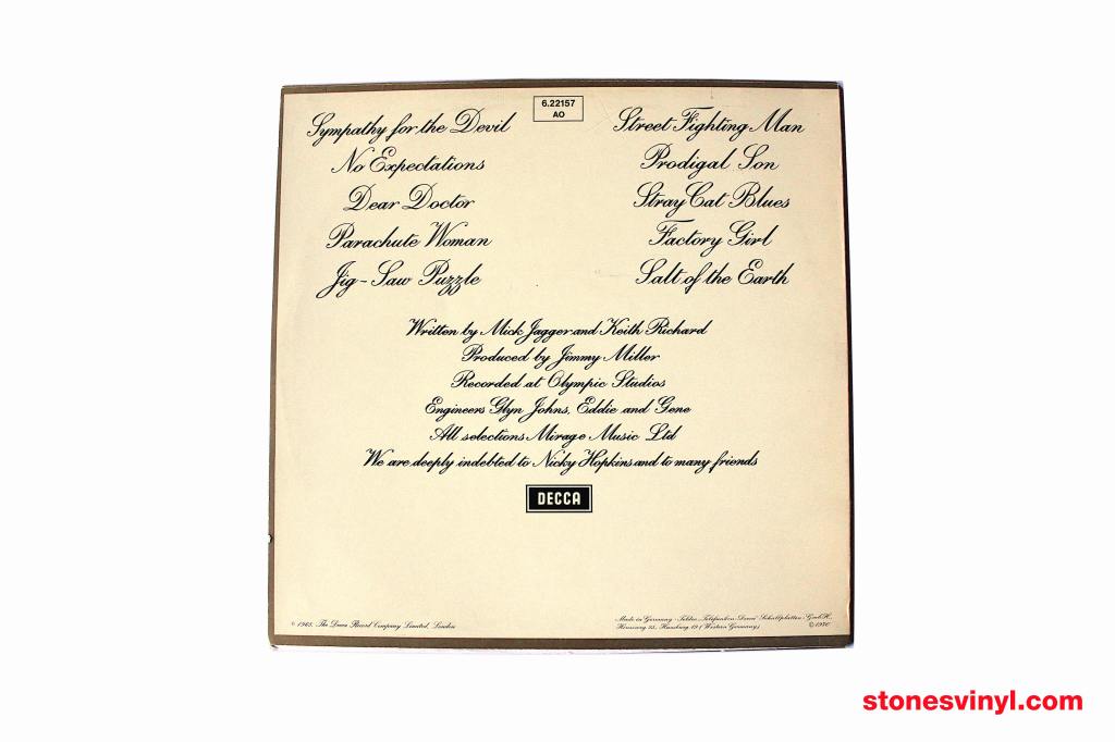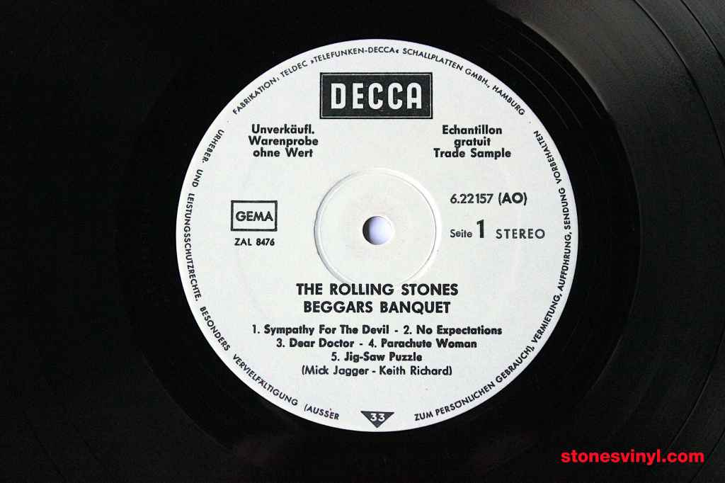 ‘Beggars Banquet’ white label promo LP re-issue released in Germany in 1975. Cat: 6.22157 AO. Tracklist side A: Sympathy For The Devil, No Expectations, Dear Doctor, Parachute Woman, Jig-Saw Puzzle. Tracklist side B: Street Fighting Man, Prodigal Son, Stray Cat Blues, Factory Girl, Salt Of The Earth.