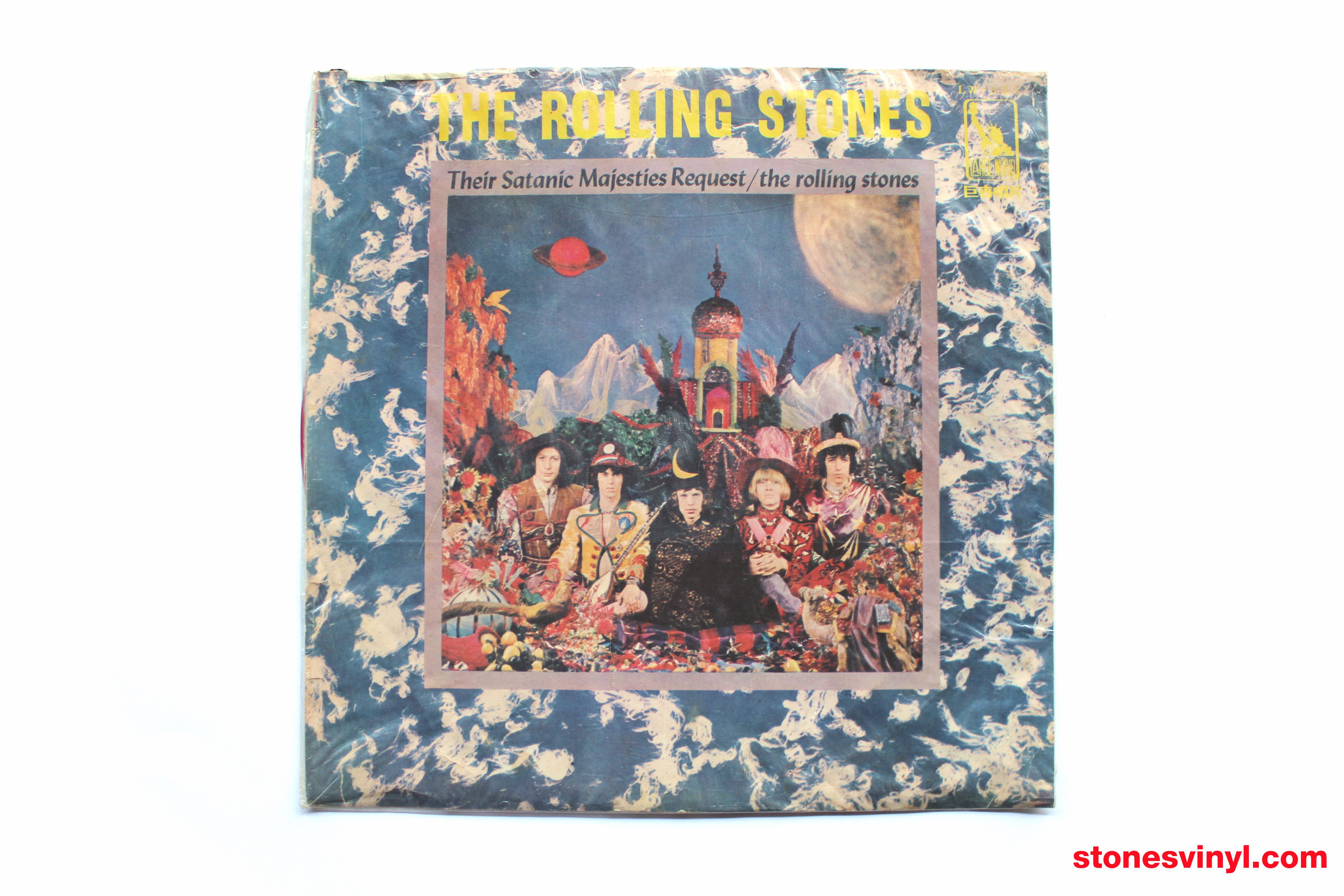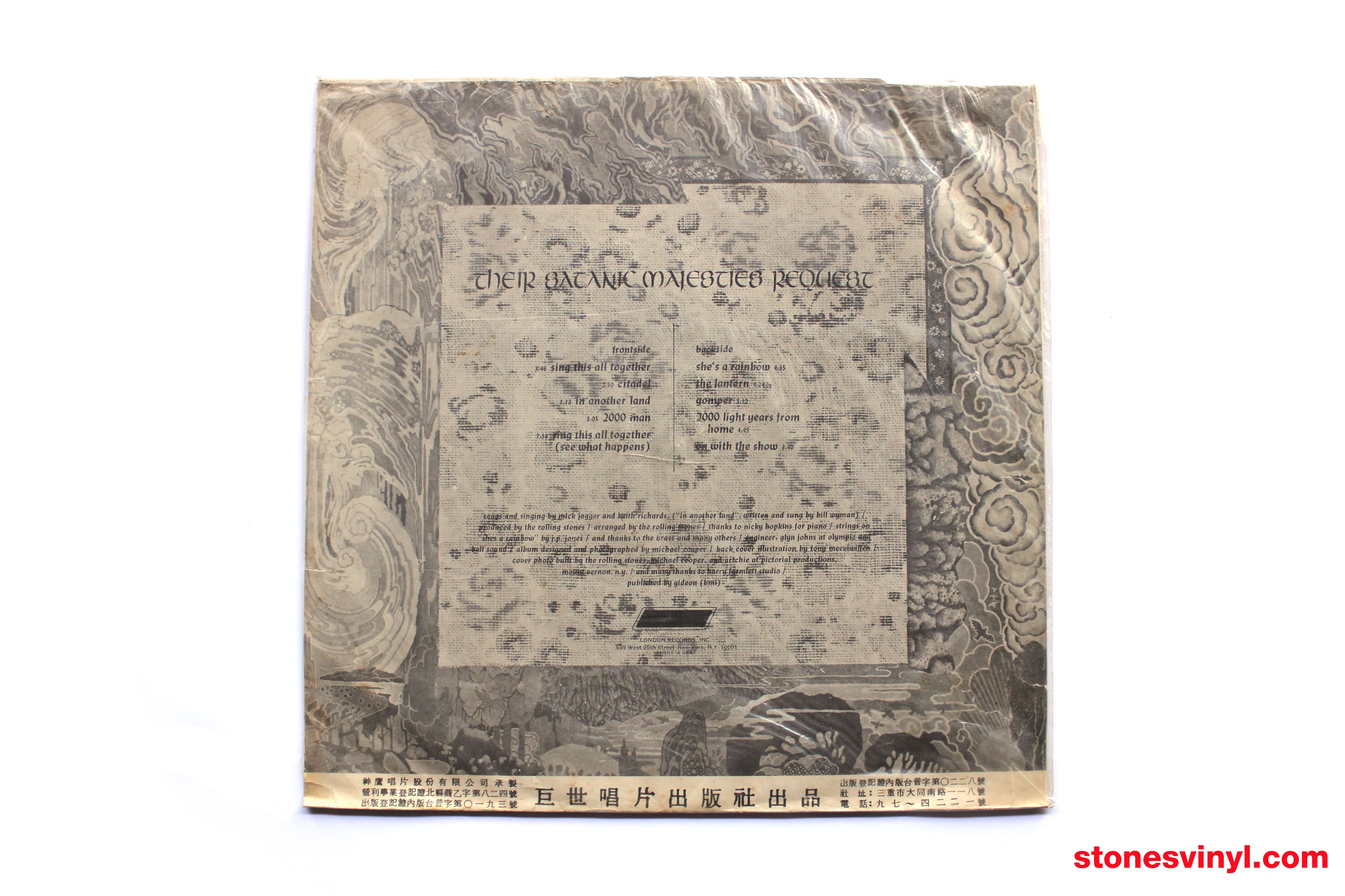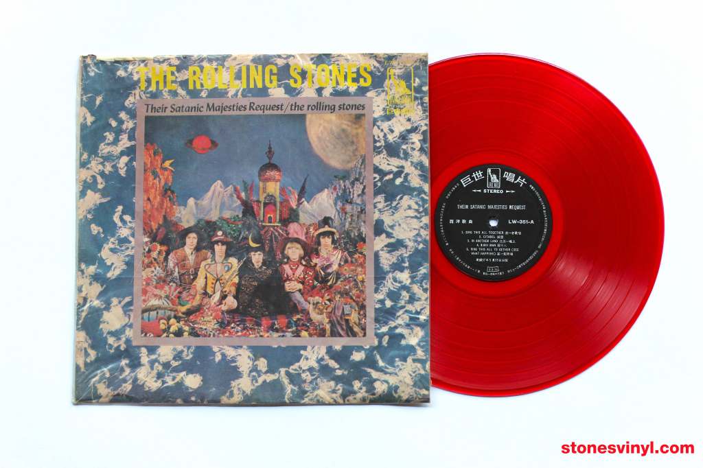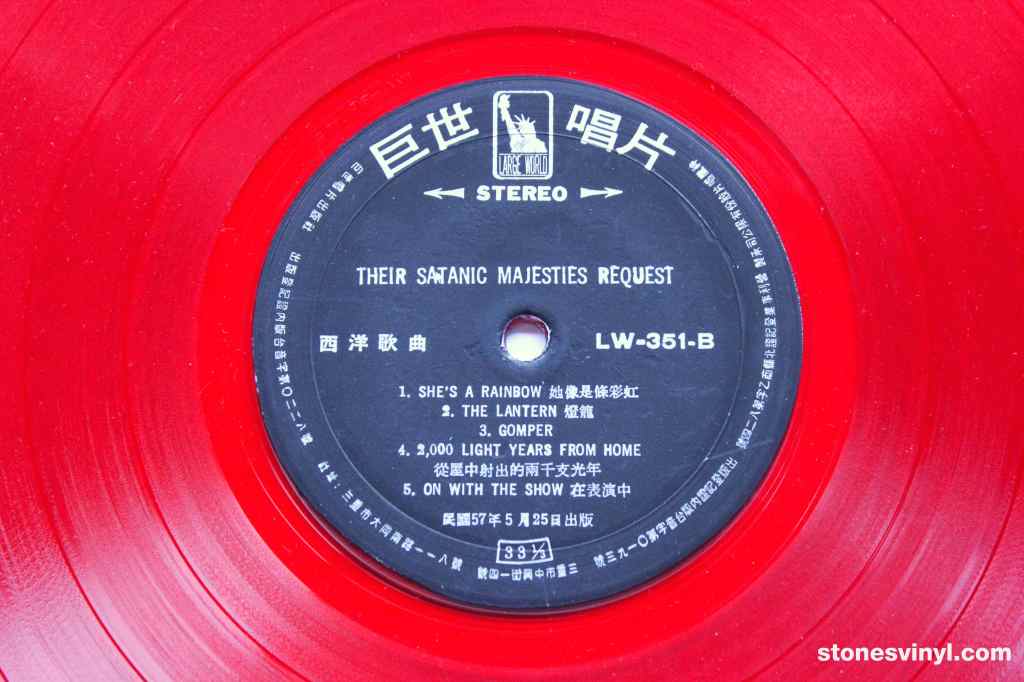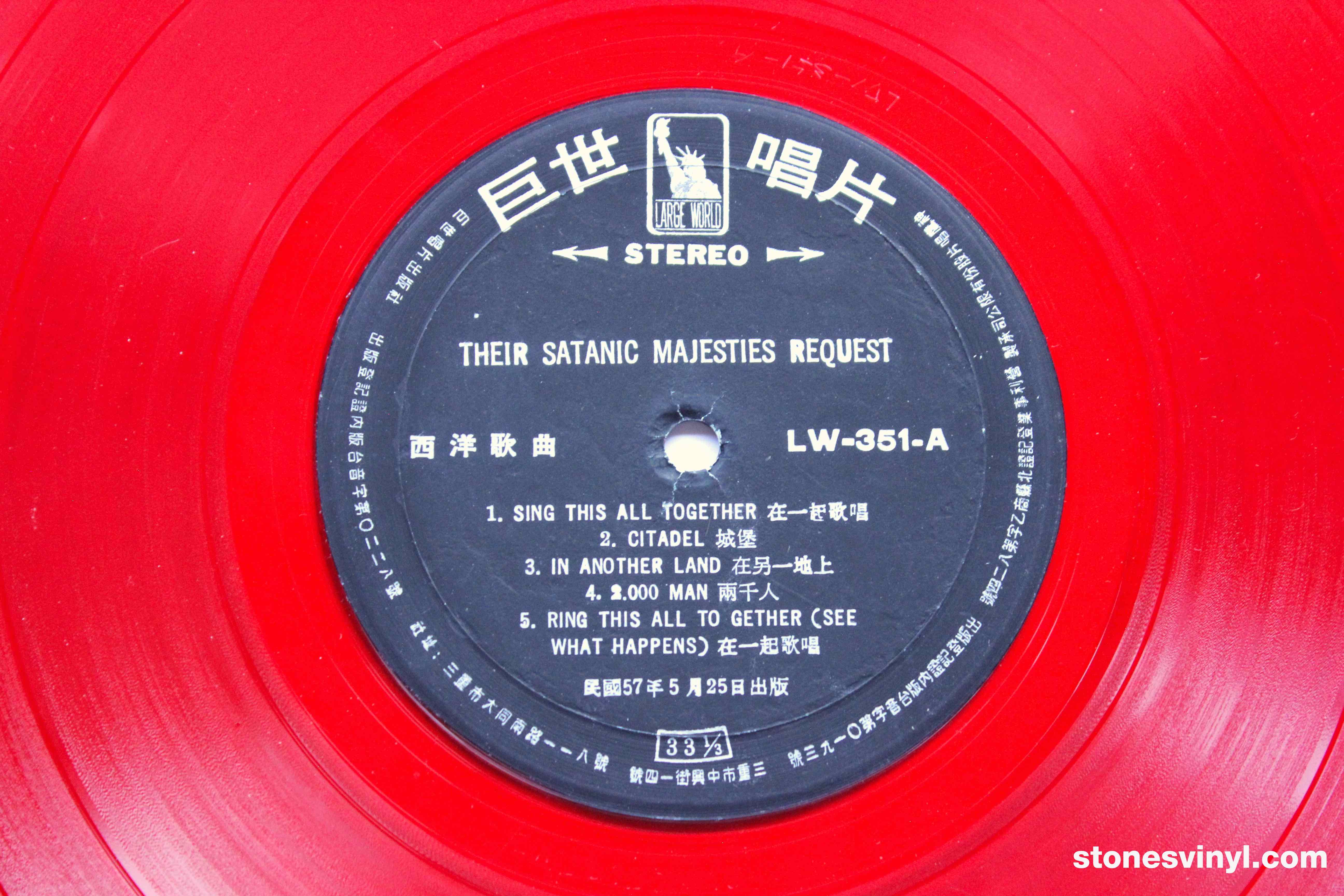 ‘Their Satanic Majesties Request’ LP released in Taiwan in 1967, on Large World label. Translucent red vinyl. Cat: TXS 103. Tracklist side A: Sing This All Together, Citadel, In Another Land, 2000 Man, Sing This All Together (See What Happens). Tracklist side B: She’s A Rainbow, The Lantern, Gomper, 2000 Light Years From Home, On With The Show. Pressed in Taiwan. Distributed in a polyester lined sleeve.
